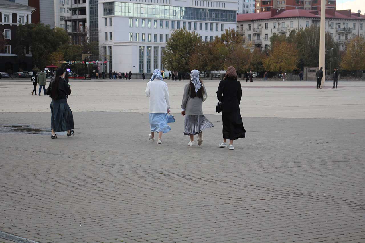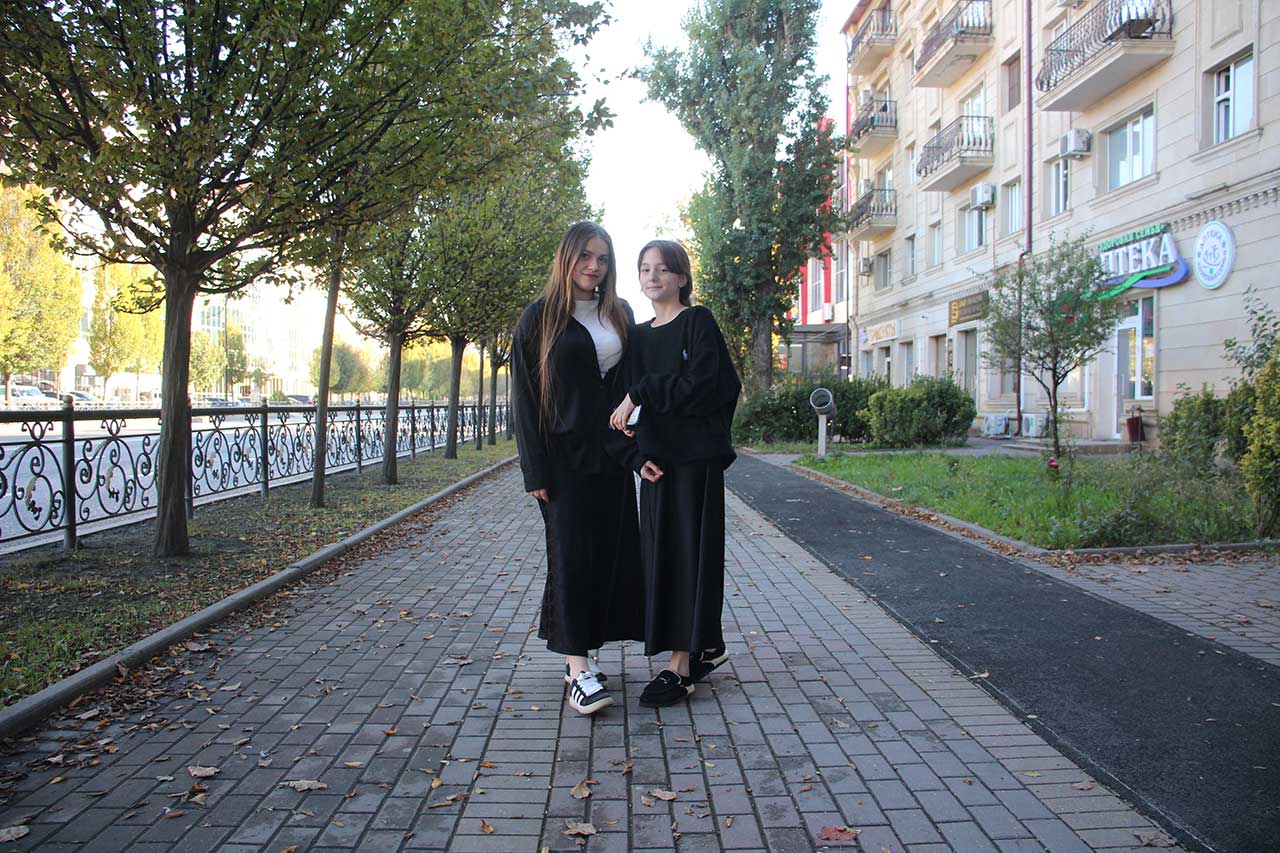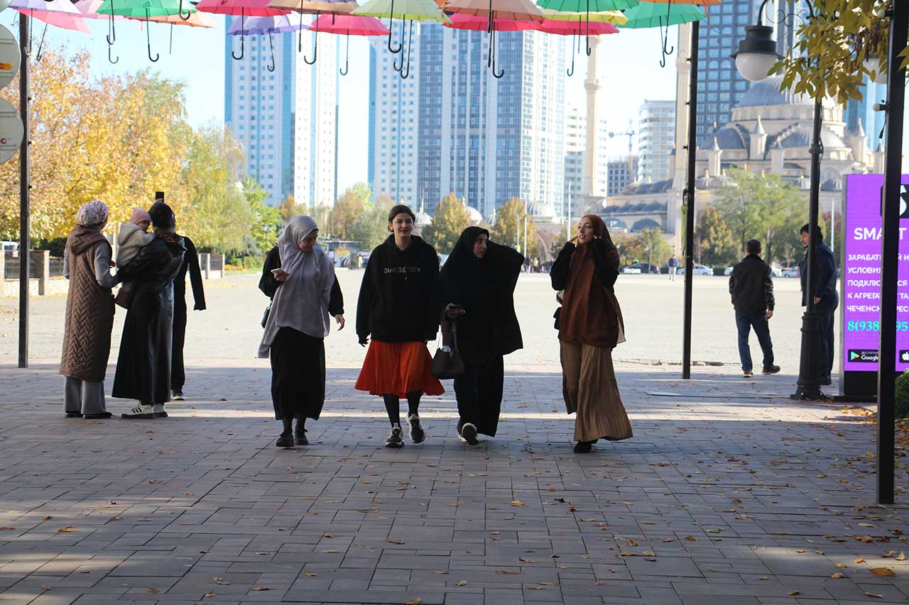 Чеченская мода — пиджак/куртка, юбка до щиколотки и кроссовки.