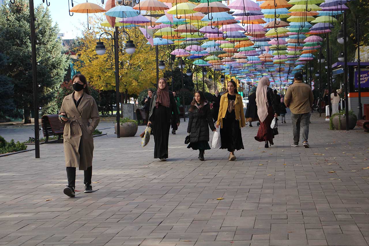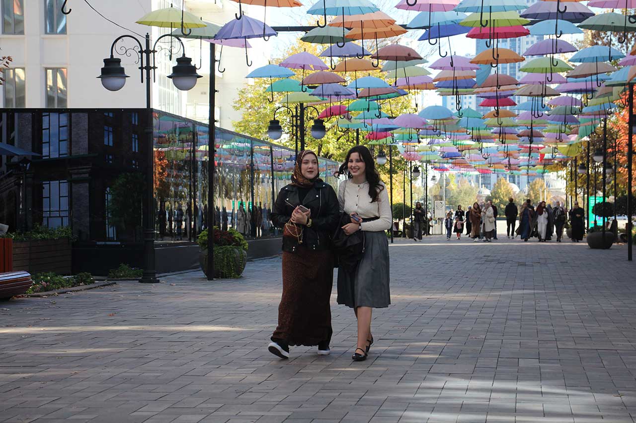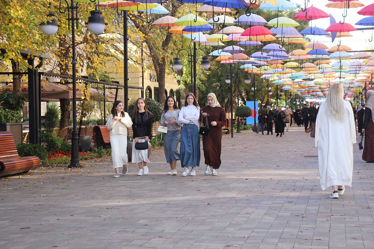 Чеченская мода — пиджак/куртка, юбка до щиколотки и кроссовки.