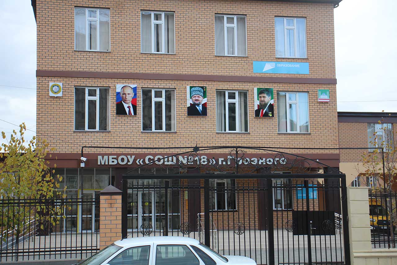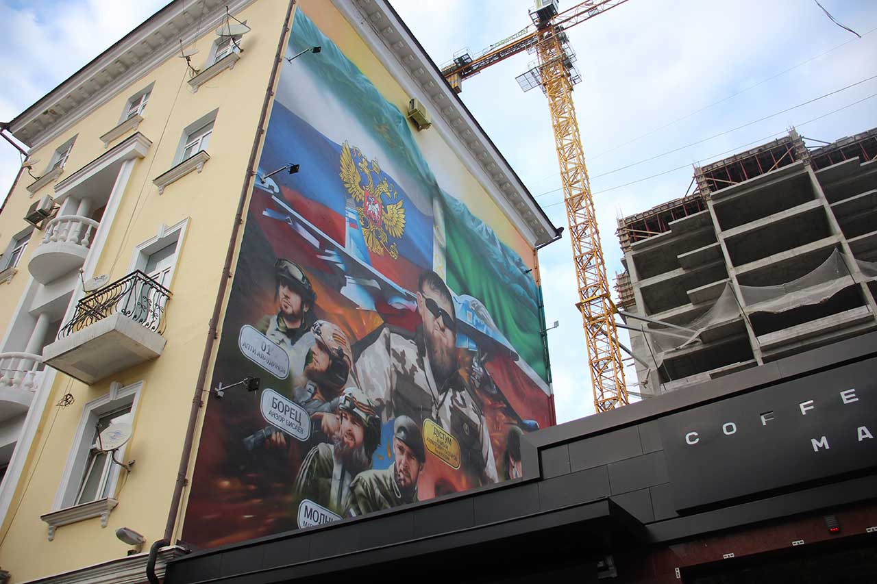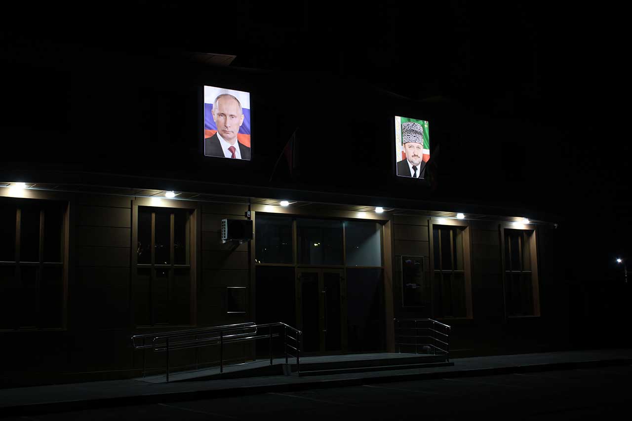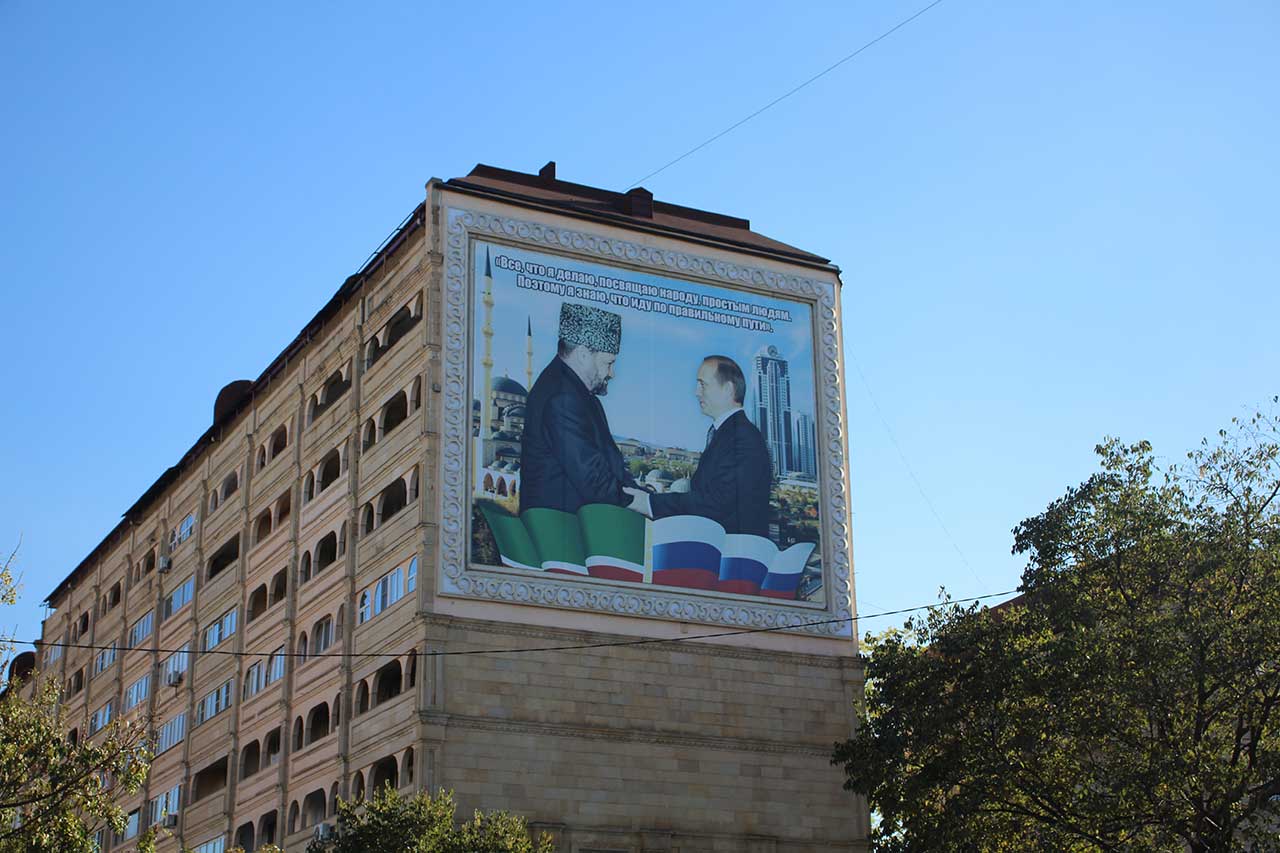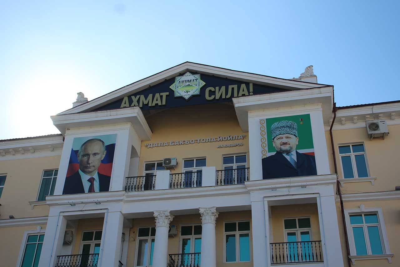 Улицы покрыты портретами Ахмата Кадырова и Владимира Путина.