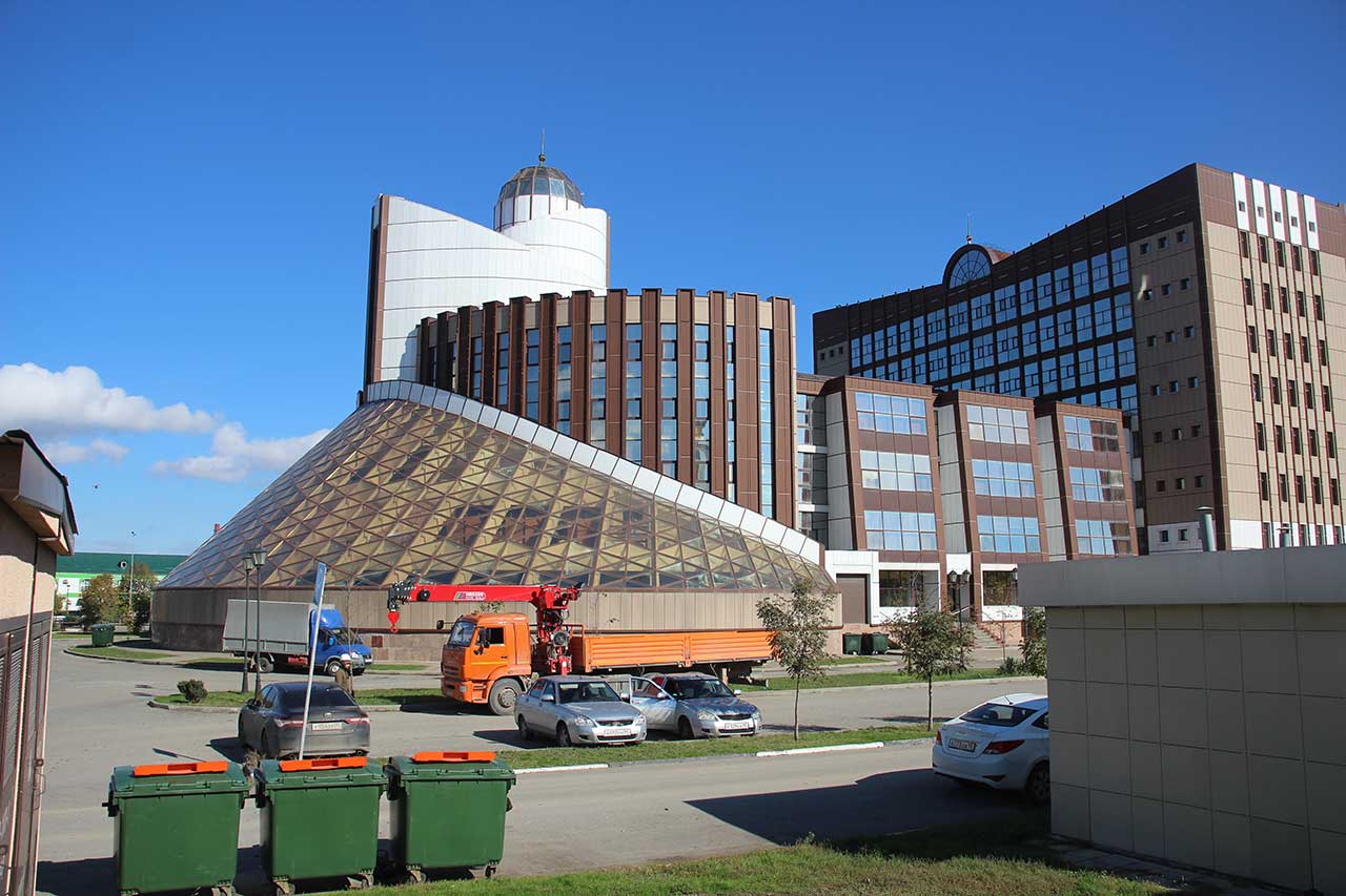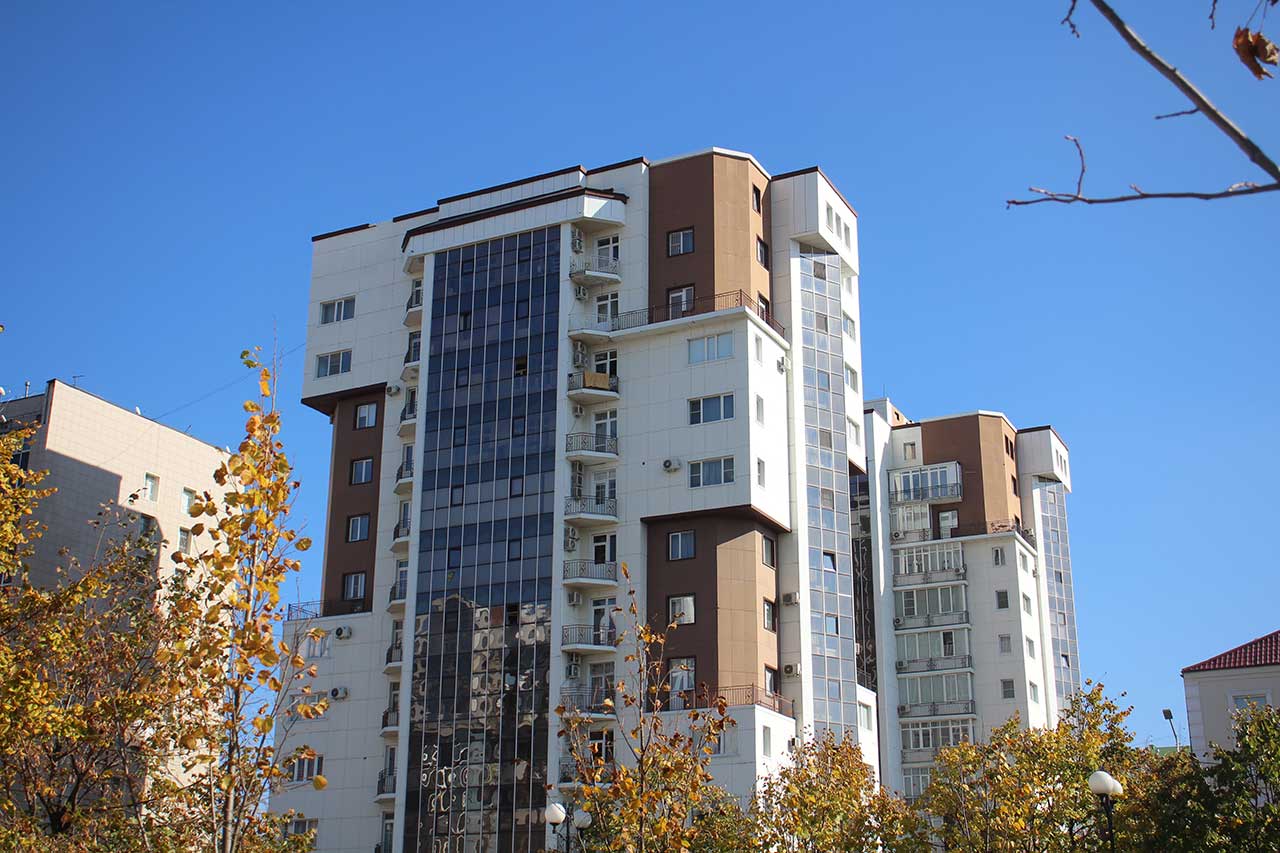 Архитектурный лейтмотив — бежевый с синим стеклом.