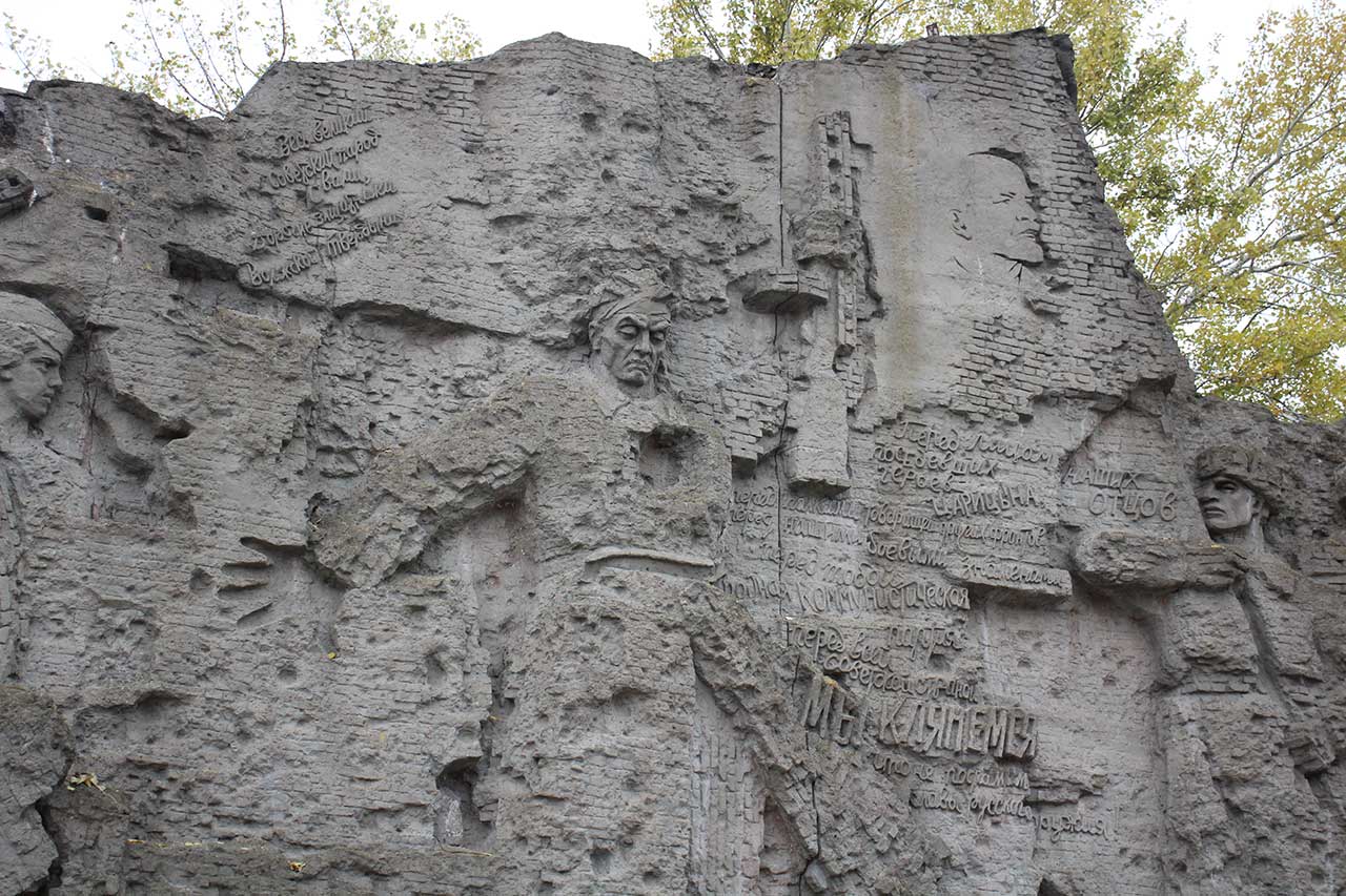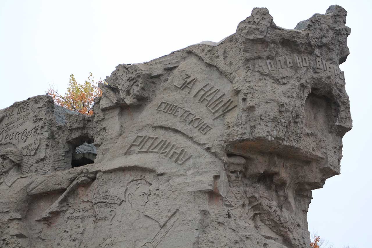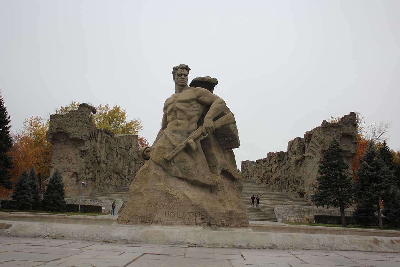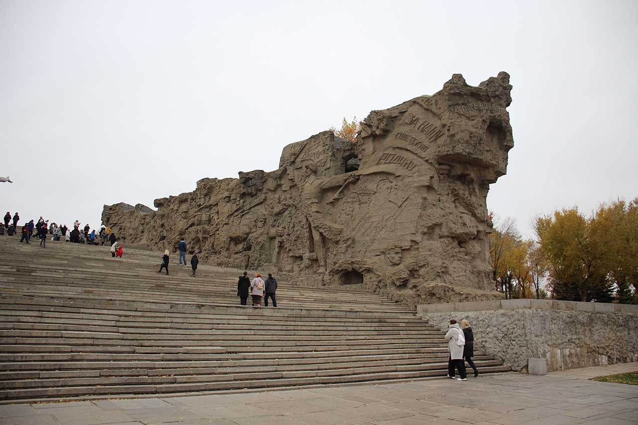 Идем на Мамаев курган. При входе монумент «Стоять насмерть!»