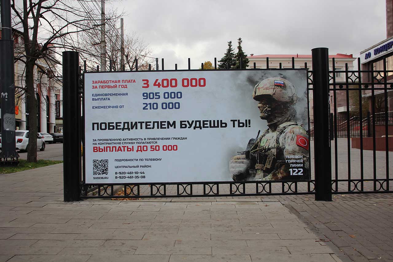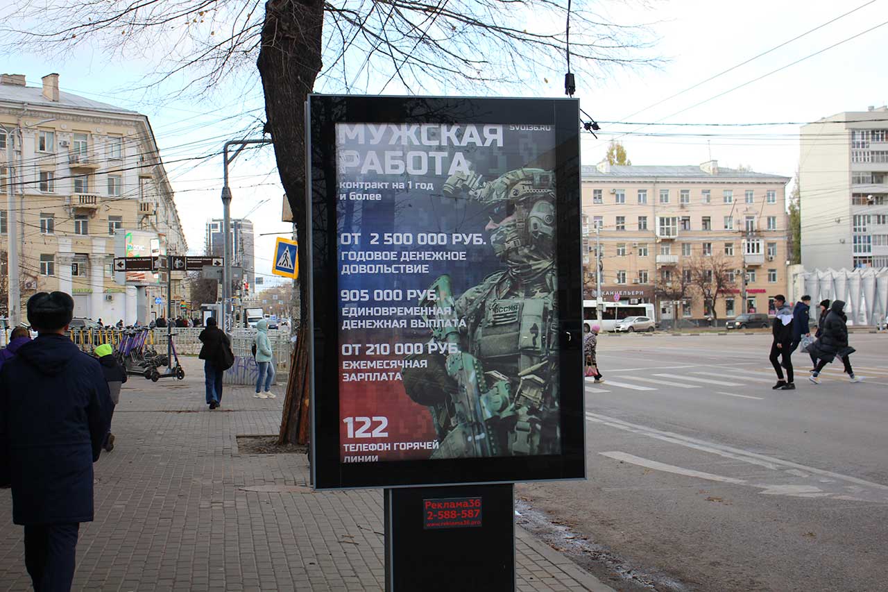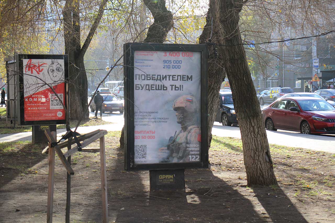 В городе огромное количество рекламы службы по контракту. Возможно, из-за непосредственной близости к фронту.